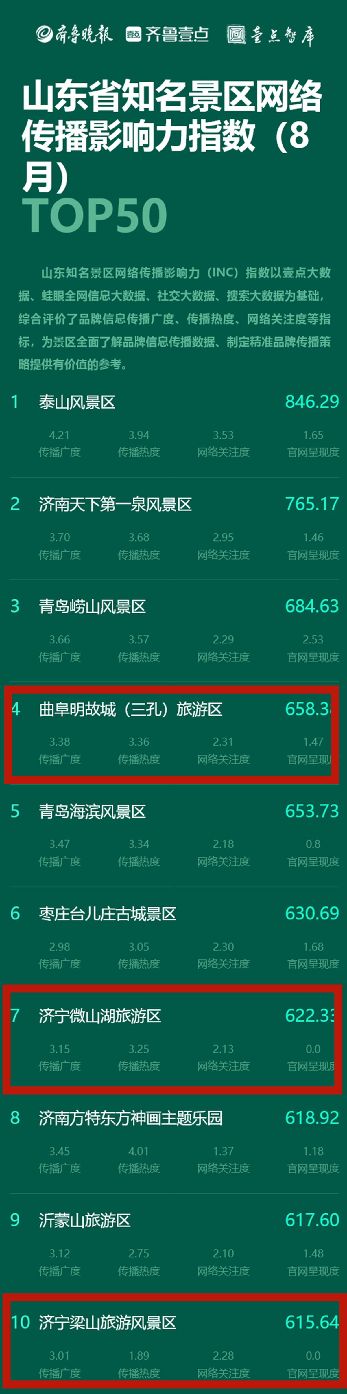 近日,由齊魯晚報(bào)、齊魯壹點(diǎn)、壹點(diǎn)智庫(kù)發(fā)起的山東省知名景區(qū)網(wǎng)絡(luò)傳播影響力指數(shù)發(fā)布,我市8月份有三家景區(qū)進(jìn)入榜單前十名,數(shù)量全省第一,均為孔子文旅集團(tuán)旗下景區(qū),分別是曲阜明故城(三孔)旅游區(qū)、微山湖旅游區(qū)和水泊梁山風(fēng)景區(qū)。